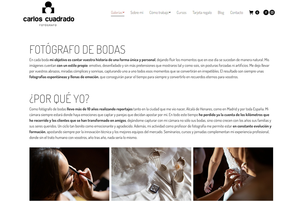 Carlos Cuadrado es un fantástico fotógrafo madrileño de eventos y reportaje. Para el diseño de su sitio web hemos mostrado una selección variada de sus imágenes así como de los demás productos que ofrece: Cursos de fotografía, newsletter, blog, bonos de descuento. Un diseño elegante y profesional. También se realizó un trabajo muy acorde con la creación del logotipo y el desarrollo de marca.