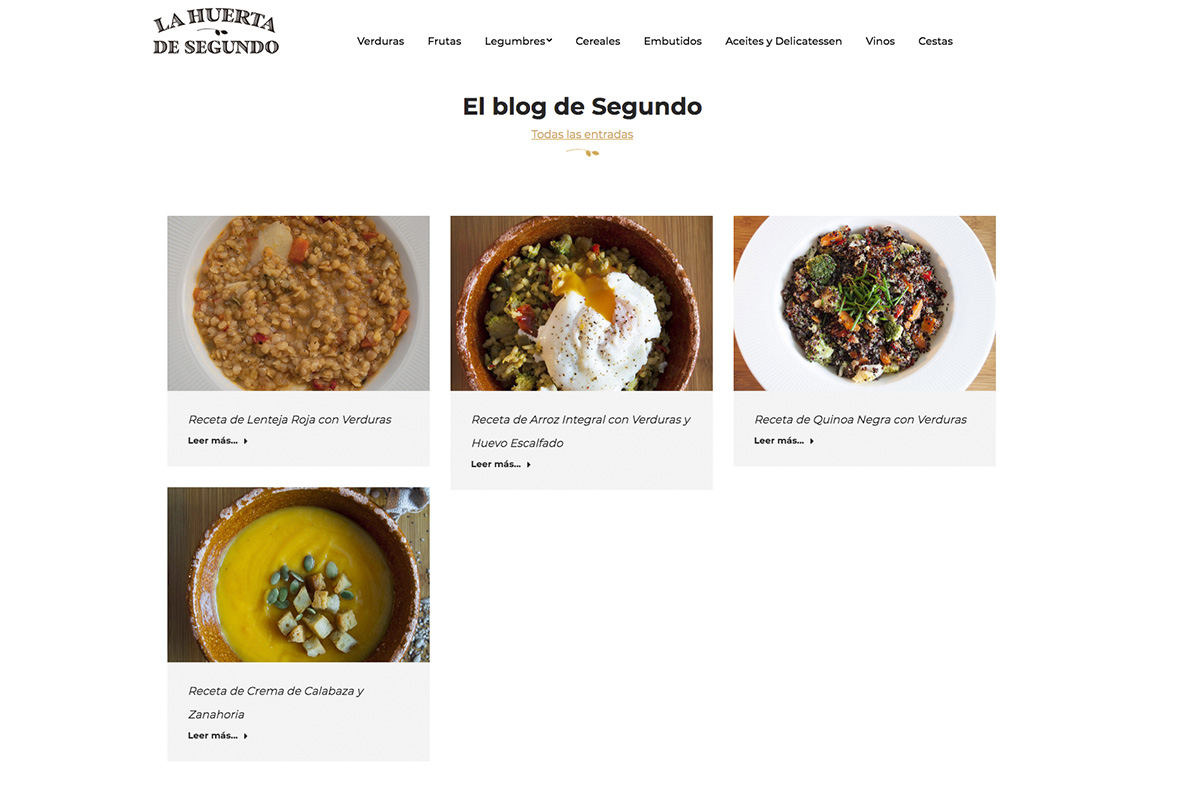 Diseño del sitio web La huerta de Segundo, portal de venta online de productos frescos: verduras, frutas, cereales, etc. Se ha ideado también todo el branding con creación de logotipo y aplicaciones de la marca para diversos elementos como tarjeta, papelería, embalaje, etc.